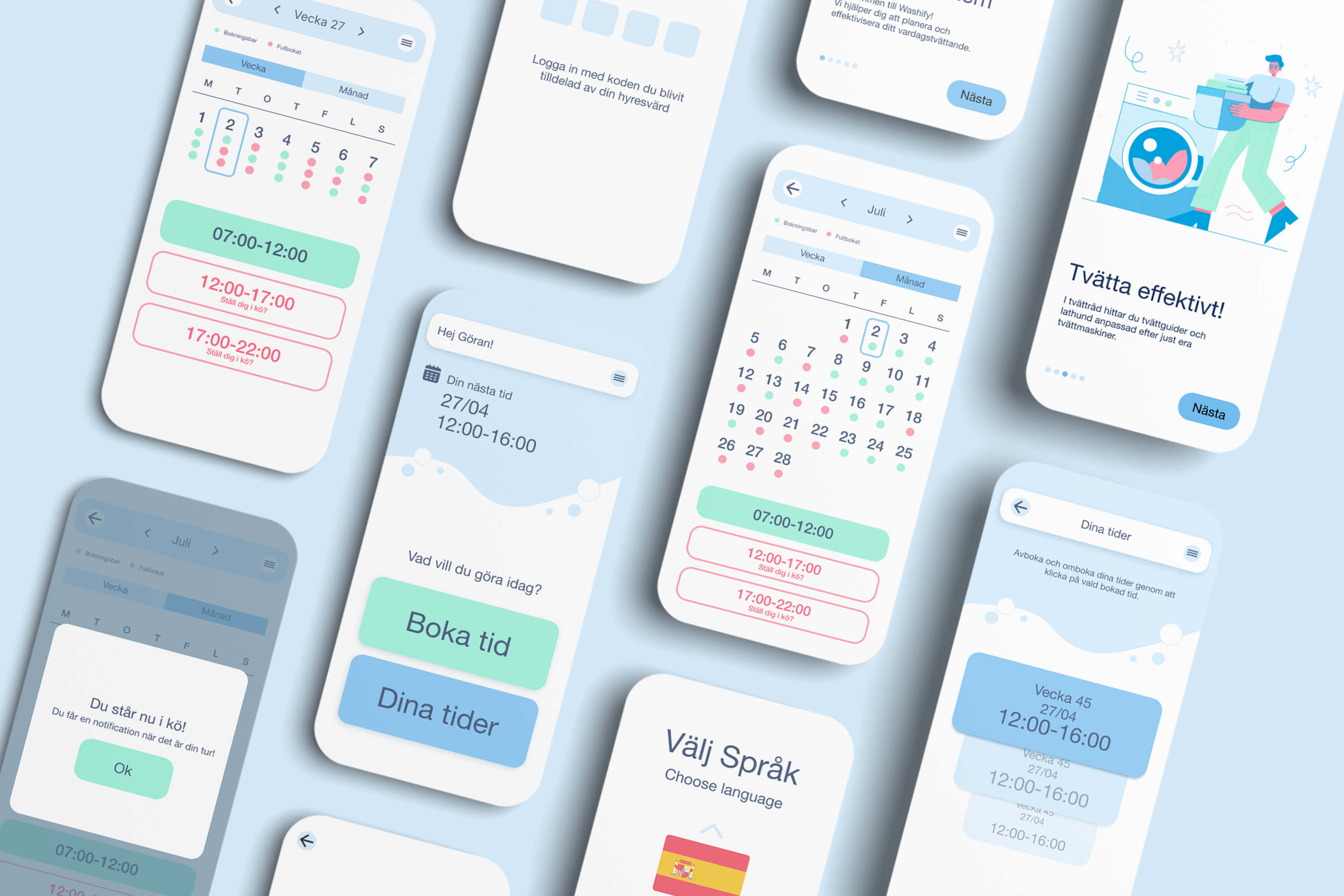 The laundry booking system allows users to book, wash, and manage their laundry in an efficient and sustainable way. Both in mobile and touchscreen in the utility room. To make it user-friendly for all ages and levels of experience, we needed to focuse on clarity, simplicity, and logical navigation. It also required to be sustainable, encouraging, and rewarding to use, to do that it needed to include:A date/time queuing system for residents, an easy-to-use calendar view with monthly, weekly, and daily overviews. And a simple, clear step-by-step flow for booking, unbooking and queueing laundry slots. This ensures that users can confidently manage their bookings and clearly see when a time has been reserved or rescheduled.By prioritizing only the most essential elements and necessary functions, we created a booking system that makes it easy and seamless for a wide range of users to manage their everyday laundry without frustration. To support and enhance all functionalities, a harmonious, simple, and modern design was introduced featuring calm and fresh colors, a clear typeface and intuitive icons.